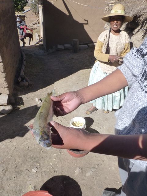 We went to a village called Atunkolla to visit with farmers and were invited to lunch. We knew that going to rural farmland in Peru meant we would be eating what they ate, which made us nervous, being strict vegetarians. We were very concerned about the prospect of coming off as rude and therefore making it harder for us to gain access to more communities. We resigned ourselves to the fact that if we were served fish, we would thank our host kindly and try not to vomit. Most of the time, farmers didn’t stray from their normal lunches when we visited and they almost never consisted of meat. This day, however, we were not so lucky. We were served boiled fish staring up at us from a plate of rice, accompanied by a bowl of the water the fish was boiled in. The smell, as you can imagine, was overpowering.