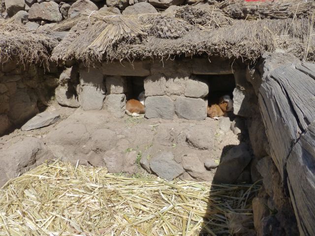 A guinea pig cage with multiple cubbies for sleeping. The guinea pig house was a replica of a traditional Aymara house.