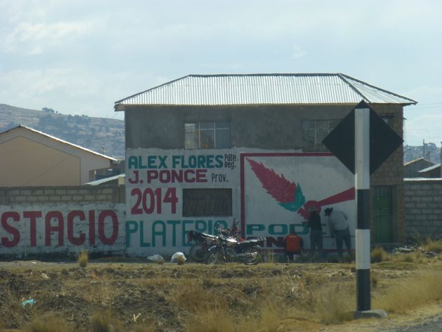 The landscape in the altiplano during this time of year is very dry and dead. The most colorful and interesting things to look at while whizzing by in a van are the political ads painted on the sides of houses and walls.