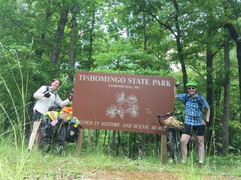 On day 23 of our journey, we headed from Tupelo toward Tishomingo State Park on the Natchez Trace Parkway. This scenic highway is a designated bicycle route that spans a total of 450 miles and follows a historic travel corridor that has been used for hundreds of years by Native Americans, settlers, slave traders, soldiers, and modern-day explorers. So far, this has been our favorite road. Not only is it lined by old oak trees that provided shade, but the road is punctuated by historic markers that took us back in time.