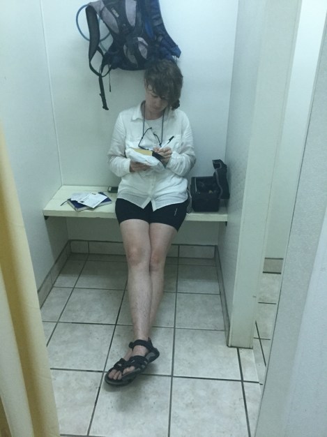 It was a very warm day and after cycling 50 miles we were tired and overheated, so we quickly set up camp and headed to the air conditioned bath house to get some relief from the heat and write some postcards.