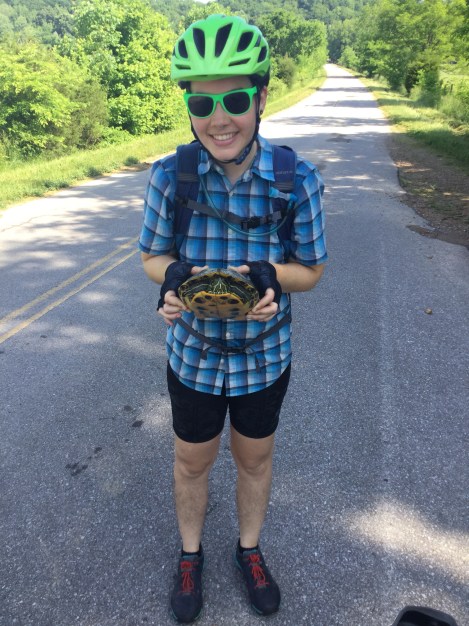 The road is not always a safe place, however. Among the obstacles that we must watch out for, besides uneven pavement, gravel, and other debris, is roadkill, the smell of which can sometimes be overpowering, especially in the humid heat. Bleeding heart animal lovers both, we send out mournful thoughts to each splattered animal we pass. So far we have seen innumerable birds, snakes, rabbits, squirrels, raccoons, possums, cats, armadillos, skunks, deer, countless insects, and turtles all eviscerated by speeding vehicles. That’s why every time we see a turtle crossing the road, we quickly hop off our bikes and help them finish their journey across the street safely.