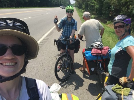 All of the cyclists we have met so far have been going the opposite direction as us. We crossed the road to chat for a few moments with this French couple, Dominic and Pascal, who were headed from Chicago to Baton Rouge. We are always happy to see other tourists on the road and “talk shop.” We discuss routes, gear, the best places to eat and camp, and topography, which is helpful to hear from cyclists who are coming from the direction we are headed. Unlike other Adventure Cycling Association maps we have used, this portion does not include topography which has been a source of near-constant frustration.