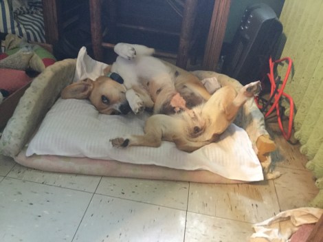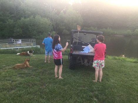 That evening, Julie’s dad John took us on a ride around their property. Our first stop was their pond, which they had dug, allowed the rain to fill up, and then they filled with catfish, which had grown enormous. John revved the engine, which he does to call the fish to him from the depths. He had brought along a jug filled with dog food that he tossed into the water for the fish. The family’s two dogs, Sunny (a boxer lab mix with an underbite rivaling our dog Chuño’s) and Lily (a St Bernard who has had 69 puppies!), as well as Dog’s two dogs, Snoop and Ziggy (a black and yellow lab), accompanied us and were very happy to jump in the water to paddle around and chomp the food that floated on the surface, clearly not willing to share with the fish.