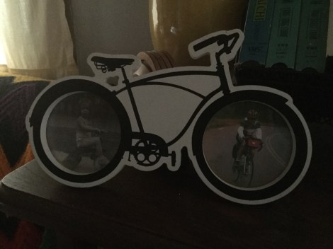Judy’s home is full of bicycle-themed items from mugs to books to the bone necklace she wears, which she carved herself. In the below bike-shaped frame is a photo of Judy as a little girl on a bicycle juxtaposed with a photo taken of her on one of her many tours, over 50 years later. Her lifelong love of bicycles was apparent at every turn.