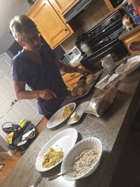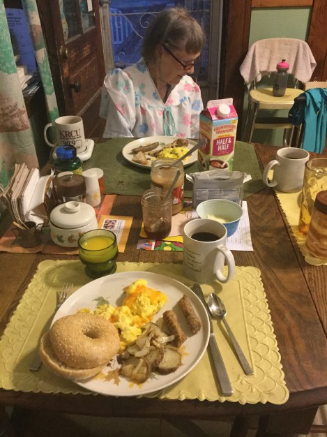 The next morning, Phyllis cooked up a delicious breakfast of eggs and pancakes, served with fresh fruit and all the coffee we could drink.