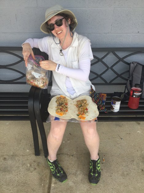 Our first stop was the small town’s grocery store, where we bought some Powerade to replace our sweated-out electrolytes. We sat on the benches outside to have our lunch of burritos which we filled with a can of beans, cheese, and the mixture of vegetables and rice that we had cooked at Judy’s house the day before. We love being able to cook a big medley of veggies and rice, seasoned with the taco seasoning that we brought, to add to our simple fare for a few days.