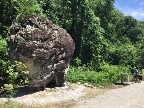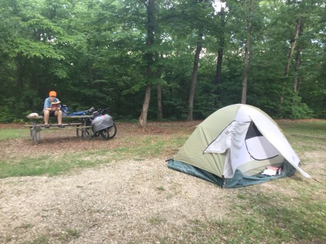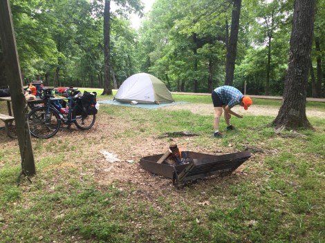 Early the next day, we headed out of town intending to cycle to Meramec State Park about 60 miles away, but after 36 miles of cycling and several minutes to fat rain drops and dark clouds threatening our safety (people entering the store where we had stopped to take a break warned us about a coming storm), we decided to stop at the nearby Washington State Park for the night instead.