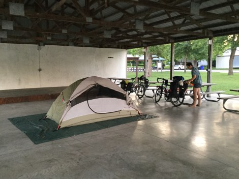 We camped that night in the Marthasville City Park. We always prefer to set up in the pavilion because it is the least buggy, the flattest, and covered just in case it rains.