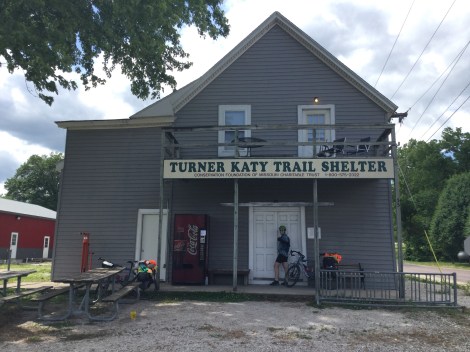 On day 41 of our journey, we arrived in Tebbets, MO, where the only accommodations (really the only thing in town other than the post office) was the Turner Katy Trail Shelter. This 40-bed shelter was once the private home of the Turner family and was generously donated to the community by Mrs. Leone Turner. The shelter is now used by cyclists and community groups. We gladly paid the suggested donation of $5 each per night. This shelter did not provide bedding, unlike the numerous overpriced B&Bs that dot the trail, but we were able to have a hot shower and cook in the kitchen. We carry camping gear so it worked out just fine for us to use our own sleeping bags and pillows on the bunk beds. We saw many other cyclists on the trail, some were carrying small panniers, but they clearly were not as well-equipped as we are because we were the shelter’s only occupants that night.