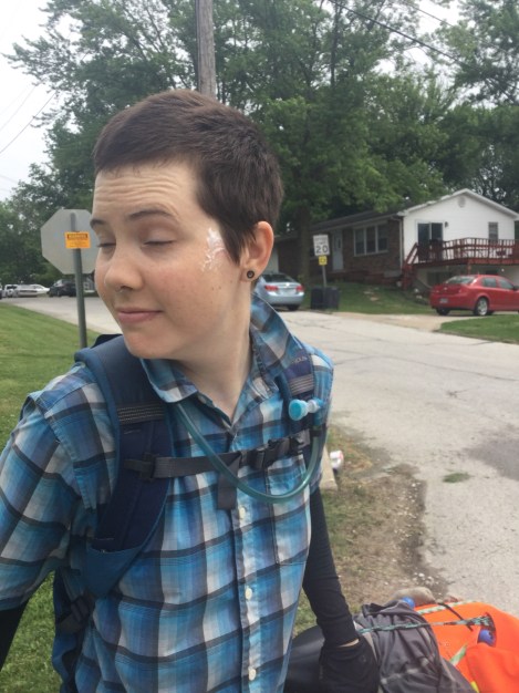 The next day, day 43, we headed toward Marshall, MO after checkout at 11 (we like to get our money’s worth when we stay in hotels). After only a few miles on the road, we had to pull over and do our first roadside triage. Much like cars, we are frequently pelted by insects of all varieties, which mostly just bounce off. This morning, however, Mi, nor the bee that hit their face, made it out of that encounter unscathed. Luckily, we have been carrying baking soda to put in our shoes to prevent odor and to keep bugs out while we camp, so we quickly made a paste with water, which we know instantly draws out the venom and soothes the sting. Soon after, we were back on the road again.