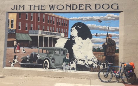 At around 3 P.M., we finished the short 35-mile day in Marshall. We cycled down Main Street to the visitor center, which was also a museum dedicated to Jim the Wonder Dog. Jim, who was born in 1925, was a champion hunting dog. In addition to being named the Hunting Dog of the Century, Jim was also psychic. He could follow commands in multiple languages, including Morse Code, pick out strangers in crowds based on limited descriptions, alert to people in need, predict the sex of unborn babies, and he even chose the winner of seven Kentucky Derbies.