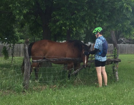Other times, we cycle past herds of cows that stare blankly at us from their pastures, past groups of goats that bleat and flick their tails as we whizz by, and past horses that raise their heads with cautious curiosity. This particular horse was more than curious and even moved closer to the fence as we neared. His eyes and body language insisted that we pull over to give him some attention, which Milo was happy to oblige.