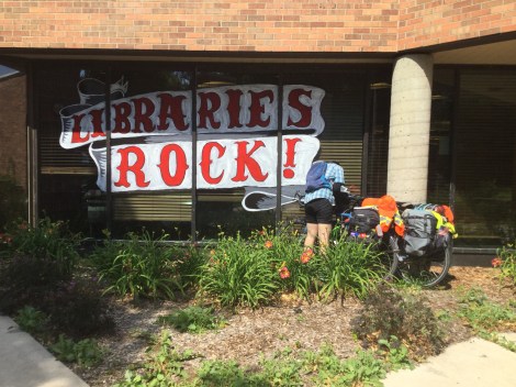 Typical city-folk leery of leaving our bikes unattended, we decided to lock them together in a planter so we could see them through the library window while working on the computer. The only problem was that the adult computer room did not have windows, so we asked the librarian if we could work in the children’s computer room to keep an eye on our bikes. He said, “sure, if you can handle it.” We spent the next few hours grinding through our last blog entry with the shrill voices of pre-teens playing computer games ringing in our ears.
