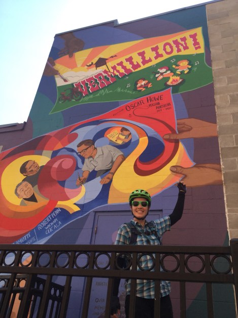 As we have mentioned before, when we are on the road we must be diligent about not falling too far behind in our blog entries, so the first thing we do after taking a photo at the state line is head for a library to recount tales from the state we just cycled through. The day we cycled into the cute university town of Vermillion, South Dakota we had only planned to stop there for lunch before continuing for another 30 miles, to complete 60 miles for the day. The day before, however, was our highest mileage day thus far of the trip at 82 miles. We didn’t realize when we set off the next morning how tired we were so we found an Asian buffet lunch and considered our options. We decided to cut the day short and work on our blog after lunch instead. We asked the warm showers host we had stayed with the night before to help us find a host in Vermillion and once we had our lodgings set up, we headed to the local library.