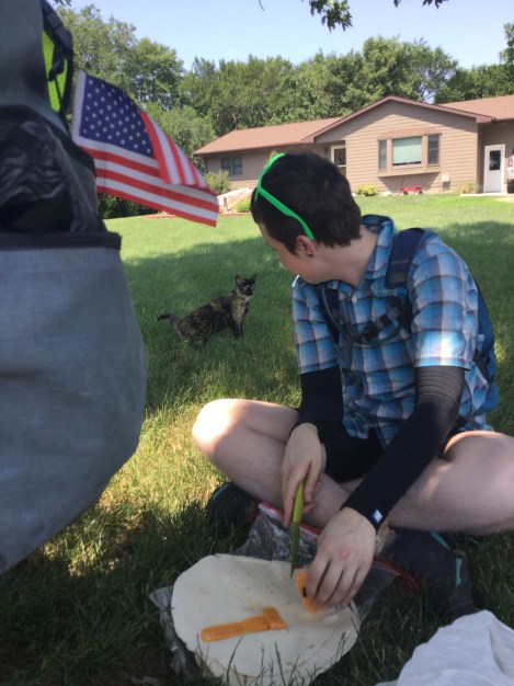 Full of high-energy food, we hit the road toward Springfield, 60 miles away. We got a great start that morning and were able to go a long way before having to stop to eat. The road was pretty barren and there was not much cover as the day heated up at the beginning of a heat wave. We were getting hungry and still had miles to go before arriving in town, so we stopped at the first farmhouse that we saw to ask if we could eat our lunch in the shade of a giant tree in their front yard. When we pulled up there was nobody around, but after a few moments a woman drove up who gladly allowed us to have our little picnic.