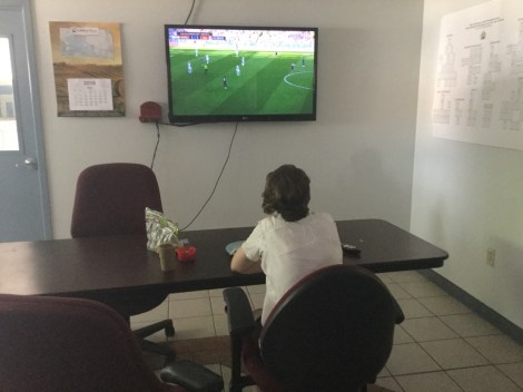 The next morning, we got up early, made a pancake breakfast, and got ready to leave. We flicked on the news and were dismayed by the weather report that indicated an extreme heat advisory now couple with thunder storms. We weighed our options and decided to stick around in town for the day until the head wave passed. So, we spent the day sequestered in the Springfield fire station, the only place we could find with a tolerable temperature. Fortunately for us, there was a kitchen and a TV so we were quite happy to eat frozen pizzas and watch the first games of the World Cup.