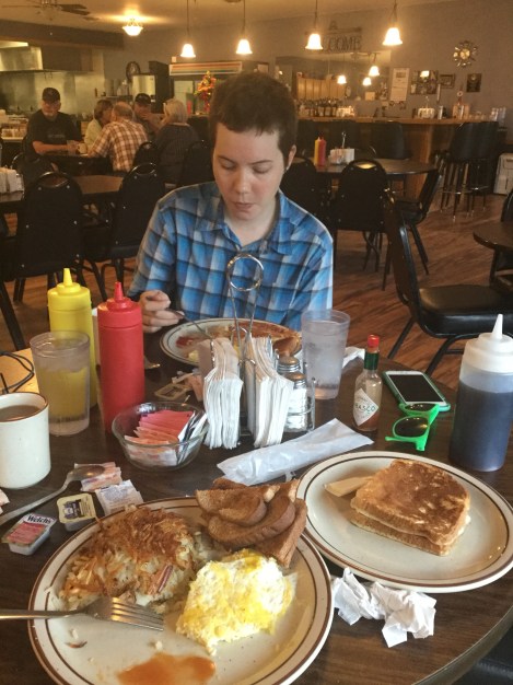 The next day we were all set to go and the last thing to do was eat breakfast at the hotel before hitting the road. Unfortunately, though, while Kelly ate breakfast, Mi was throwing up last night’s dinner.